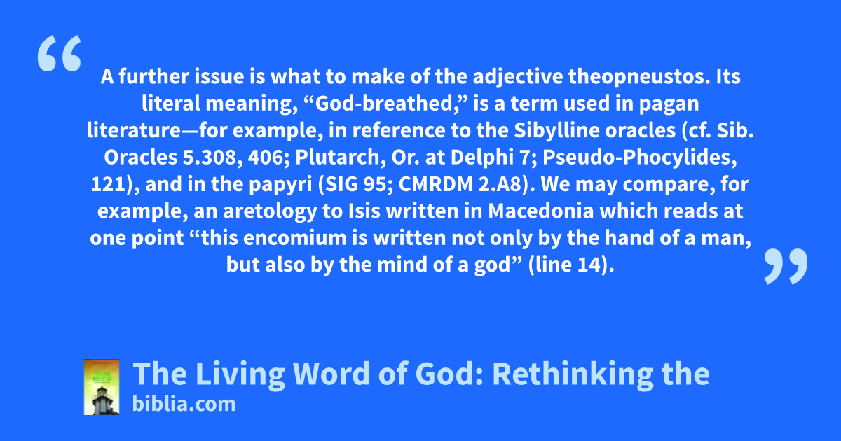 A further issue is what to make of the adjective theopneustos. Its literal meaning, “God-breathed,” is a term used in pagan literature—for example, in reference to the Sibylline oracles (cf. Sib. Oracles 5.308, 406; Plutarch, Or. at Delphi 7; Pseudo-Phocylides, 121), and in the papyri (SIG 95; CMRDM 2.A8). We may compare, for example, an aretology to Isis written in Macedonia which reads at one point “this encomium is written not only by the hand of a man, but also by the mind of a god” (line 14).