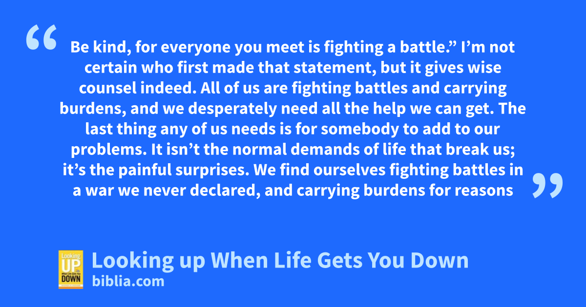 Be kind, for everyone you meet is fighting a battle.” I’m not certain who first made that statement, but it gives wise counsel indeed. All of us are fighting battles and carrying burdens, and we desperately need all the help we can get. The last thing any of us needs is for somebody to add to our problems. It isn’t the normal demands of life that break us; it’s the painful surprises. We find ourselves fighting battles in a war we never declared, and carrying burdens for reasons