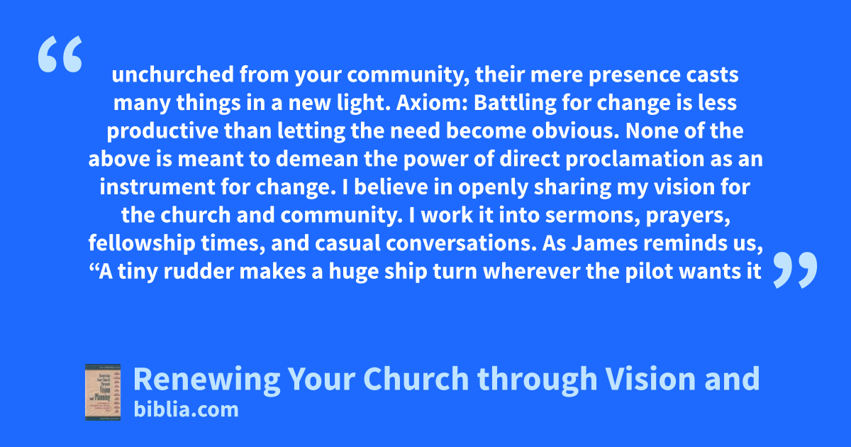 unchurched from your community, their mere presence casts many things in a new light. Axiom: Battling for change is less productive than letting the need become obvious. None of the above is meant to demean the power of direct proclamation as an instrument for change. I believe in openly sharing my vision for the church and community. I work it into sermons, prayers, fellowship times, and casual conversations. As James reminds us, “A tiny rudder makes a huge ship turn wherever the pilot wants it