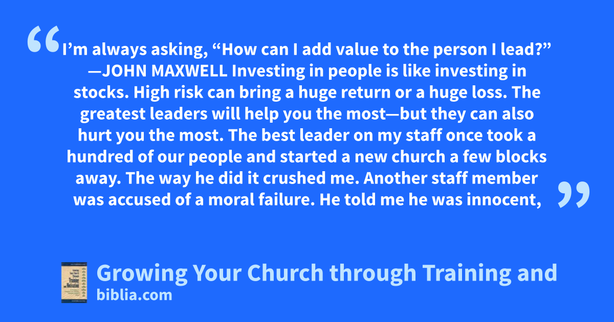 I’m always asking, “How can I add value to the person I lead?” —JOHN MAXWELL Investing in people is like investing in stocks. High risk can bring a huge return or a huge loss. The greatest leaders will help you the most—but they can also hurt you the most. The best leader on my staff once took a hundred of our people and started a new church a few blocks away. The way he did it crushed me. Another staff member was accused of a moral failure. He told me he was innocent,