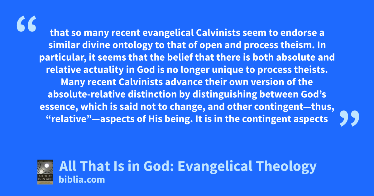 that so many recent evangelical Calvinists seem to endorse a similar divine ontology to that of open and process theism. In particular, it seems that the belief that there is both absolute and relative actuality in God is no longer unique to process theists. Many recent Calvinists advance their own version of the absolute-relative distinction by distinguishing between God’s essence, which is said not to change, and other contingent—thus, “relative”—aspects of His being. It is in the contingent aspects