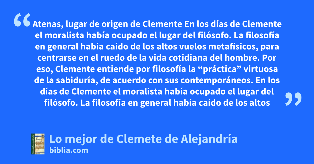 Atenas, lugar de origen de Clemente En los días de Clemente el moralista había ocupado el lugar del filósofo. La filosofía en general había caído de los altos vuelos metafísicos, para centrarse en el ruedo de la vida cotidiana del hombre. Por eso, Clemente entiende por filosofía la “práctica” virtuosa de la sabiduría, de acuerdo con sus contemporáneos. En los días de Clemente el moralista había ocupado el lugar del filósofo. La filosofía en general había caído de los altos