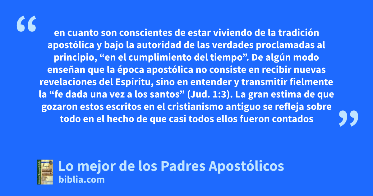 en cuanto son conscientes de estar viviendo de la tradición apostólica y bajo la autoridad de las verdades proclamadas al principio, “en el cumplimiento del tiempo”. De algún modo enseñan que la época apostólica no consiste en recibir nuevas revelaciones del Espíritu, sino en entender y transmitir fielmente la “fe dada una vez a los santos” (Jud. 1:3). La gran estima de que gozaron estos escritos en el cristianismo antiguo se refleja sobre todo en el hecho de que casi todos ellos fueron contados