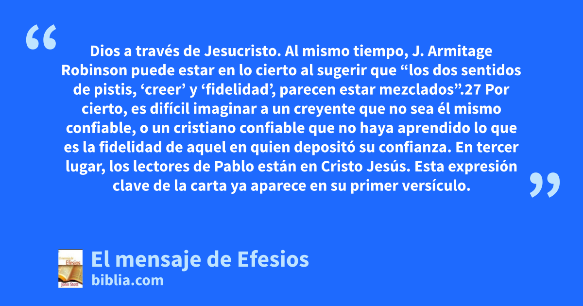 Dios a través de Jesucristo. Al mismo tiempo, J. Armitage Robinson puede estar en lo cierto al sugerir que “los dos sentidos de pistis, ‘creer’ y ‘fidelidad’, parecen estar mezclados”.27 Por cierto, es difícil imaginar a un creyente que no sea él mismo confiable, o un cristiano confiable que no haya aprendido lo que es la fidelidad de aquel en quien depositó su confianza. En tercer lugar, los lectores de Pablo están en Cristo Jesús. Esta expresión clave de la carta ya aparece en su primer versículo.