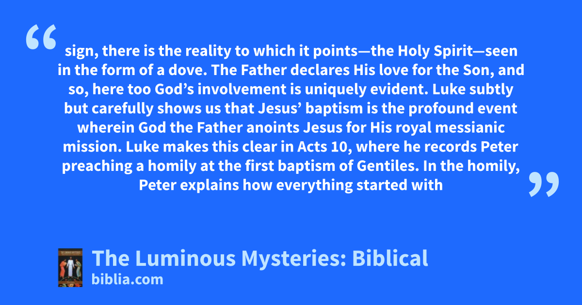 sign, there is the reality to which it points—the Holy Spirit—seen in the form of a dove. The Father declares His love for the Son, and so, here too God’s involvement is uniquely evident. Luke subtly but carefully shows us that Jesus’ baptism is the profound event wherein God the Father anoints Jesus for His royal messianic mission. Luke makes this clear in Acts 10, where he records Peter preaching a homily at the first baptism of Gentiles. In the homily, Peter explains how everything started with