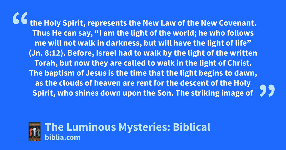 the Holy Spirit, represents the New Law of the New Covenant. Thus He can say, “I am the light of the world; he who follows me will not walk in darkness, but will have the light of life” (Jn. 8:12). Before, Israel had to walk by the light of the written Torah, but now they are called to walk in the light of Christ. The baptism of Jesus is the time that the light begins to dawn, as the clouds of heaven are rent for the descent of the Holy Spirit, who shines down upon the Son. The striking image of
