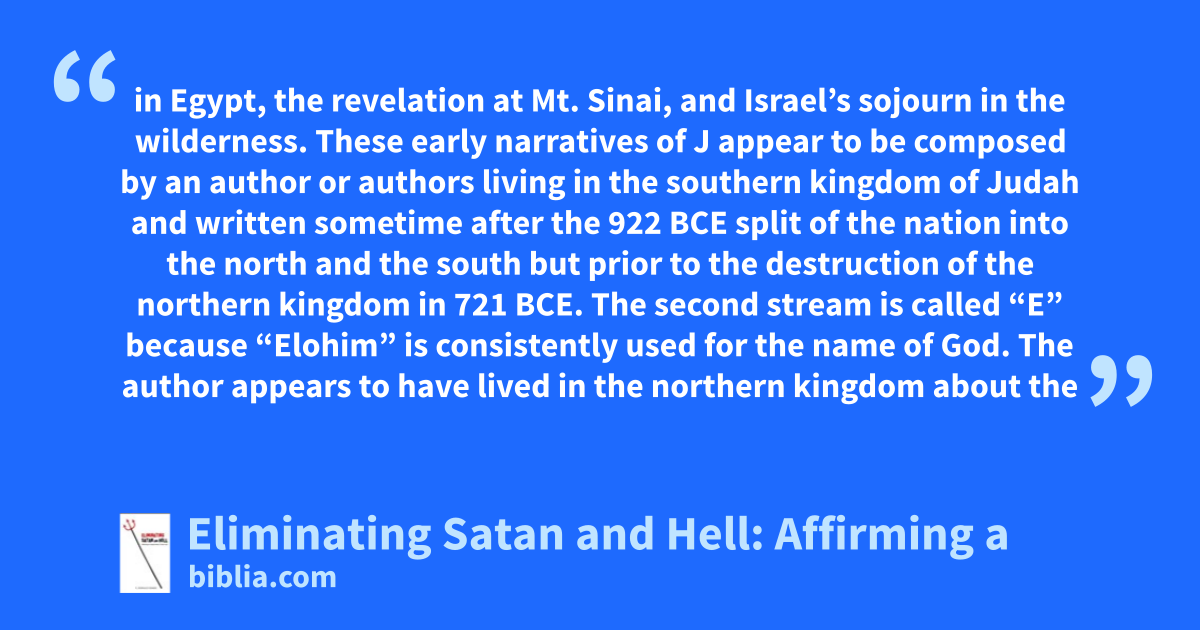 in Egypt, the revelation at Mt. Sinai, and Israel’s sojourn in the wilderness. These early narratives of J appear to be composed by an author or authors living in the southern kingdom of Judah and written sometime after the 922 BCE split of the nation into the north and the south but prior to the destruction of the northern kingdom in 721 BCE. The second stream is called “E” because “Elohim” is consistently used for the name of God. The author appears to have lived in the northern kingdom about the