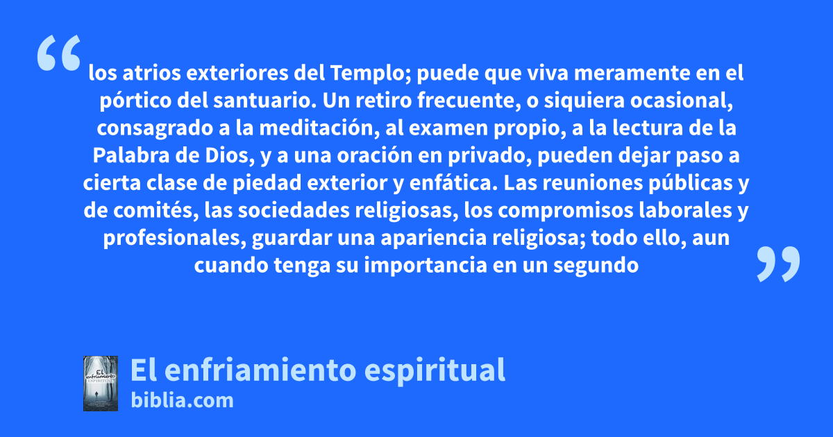 los atrios exteriores del Templo; puede que viva meramente en el pórtico del santuario. Un retiro frecuente, o siquiera ocasional, consagrado a la meditación, al examen propio, a la lectura de la Palabra de Dios, y a una oración en privado, pueden dejar paso a cierta clase de piedad exterior y enfática. Las reuniones públicas y de comités, las sociedades religiosas, los compromisos laborales y profesionales, guardar una apariencia religiosa; todo ello, aun cuando tenga su importancia en un segundo