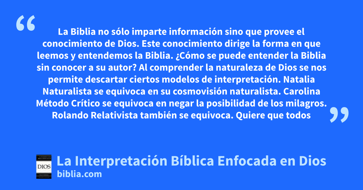 La Biblia no sólo imparte información sino que provee el conocimiento de Dios. Este conocimiento dirige la forma en que leemos y entendemos la Biblia. ¿Cómo se puede entender la Biblia sin conocer a su autor? Al comprender la naturaleza de Dios se nos permite descartar ciertos modelos de interpretación. Natalia Naturalista se equivoca en su cosmovisión naturalista. Carolina Método Crítico se equivoca en negar la posibilidad de los milagros. Rolando Relativista también se equivoca. Quiere que todos