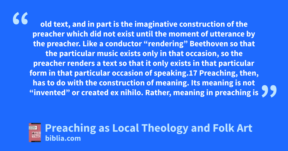 old text, and in part is the imaginative construction of the preacher which did not exist until the moment of utterance by the preacher. Like a conductor “rendering” Beethoven so that the particular music exists only in that occasion, so the preacher renders a text so that it only exists in that particular form in that particular occasion of speaking.17 Preaching, then, has to do with the construction of meaning. Its meaning is not “invented” or created ex nihilo. Rather, meaning in preaching is