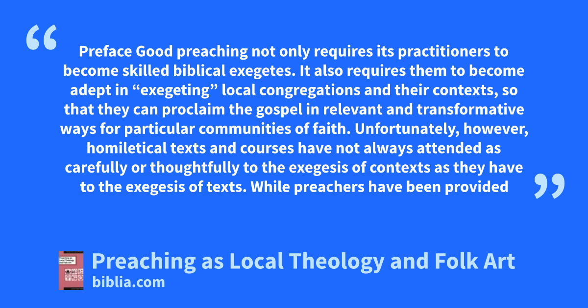 Preface Good preaching not only requires its practitioners to become skilled biblical exegetes. It also requires them to become adept in “exegeting” local congregations and their contexts, so that they can proclaim the gospel in relevant and transformative ways for particular communities of faith. Unfortunately, however, homiletical texts and courses have not always attended as carefully or thoughtfully to the exegesis of contexts as they have to the exegesis of texts. While preachers have been provided