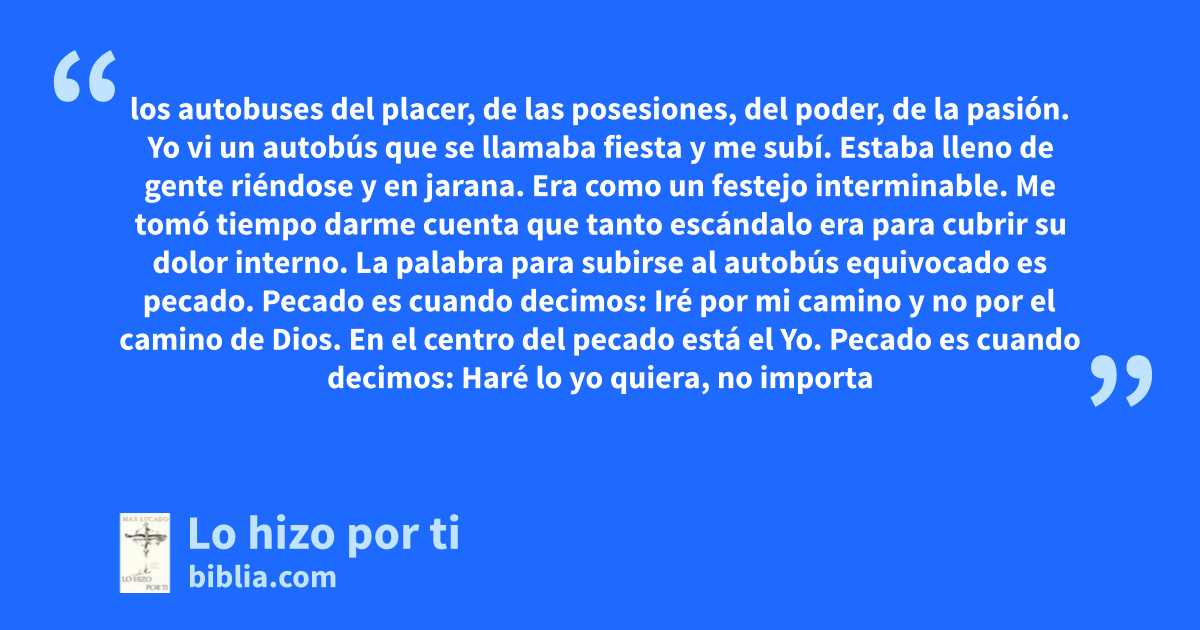 los autobuses del placer, de las posesiones, del poder, de la pasión. Yo vi un autobús que se llamaba fiesta y me subí. Estaba lleno de gente riéndose y en jarana. Era como un festejo interminable. Me tomó tiempo darme cuenta que tanto escándalo era para cubrir su dolor interno. La palabra para subirse al autobús equivocado es pecado. Pecado es cuando decimos: Iré por mi camino y no por el camino de Dios. En el centro del pecado está el Yo. Pecado es cuando decimos: Haré lo yo quiera, no importa