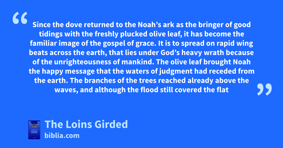 Since the dove returned to the Noah’s ark as the bringer of good tidings with the freshly plucked olive leaf, it has become the familiar image of the gospel of grace. It is to spread on rapid wing beats across the earth, that lies under God’s heavy wrath because of the unrighteousness of mankind. The olive leaf brought Noah the happy message that the waters of judgment had receded from the earth. The branches of the trees reached already above the waves, and although the flood still covered the flat