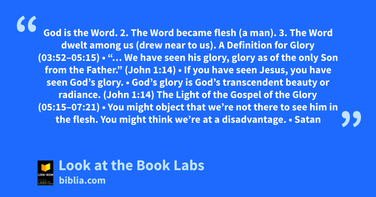 God is the Word. 2. The Word became flesh (a man). 3. The Word dwelt among us (drew near to us). A Definition for Glory (03:52–05:15) • “… We have seen his glory, glory as of the only Son from the Father.” (John 1:14) • If you have seen Jesus, you have seen God’s glory. • God’s glory is God’s transcendent beauty or radiance. (John 1:14) The Light of the Gospel of the Glory (05:15–07:21) • You might object that we’re not there to see him in the flesh. You might think we’re at a disadvantage. • Satan