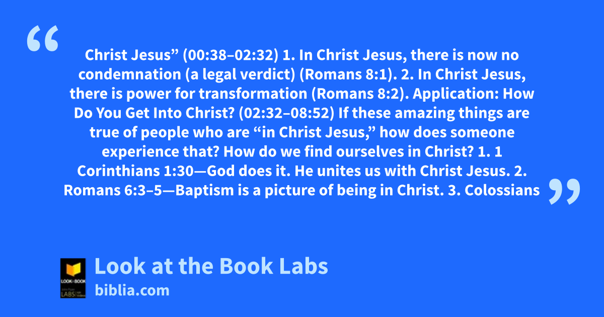 Christ Jesus” (00:38–02:32) 1. In Christ Jesus, there is now no condemnation (a legal verdict) (Romans 8:1). 2. In Christ Jesus, there is power for transformation (Romans 8:2). Application: How Do You Get Into Christ? (02:32–08:52) If these amazing things are true of people who are “in Christ Jesus,” how does someone experience that? How do we find ourselves in Christ? 1. 1 Corinthians 1:30—God does it. He unites us with Christ Jesus. 2. Romans 6:3–5—Baptism is a picture of being in Christ. 3. Colossians