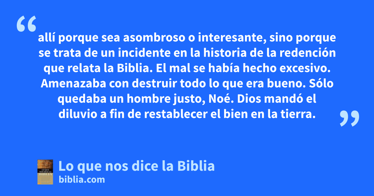 allí porque sea asombroso o interesante, sino porque se trata de un incidente en la historia de la redención que relata la Biblia. El mal se había hecho excesivo. Amenazaba con destruir todo lo que era bueno. Sólo quedaba un hombre justo, Noé. Dios mandó el diluvio a fin de restablecer el bien en la tierra.