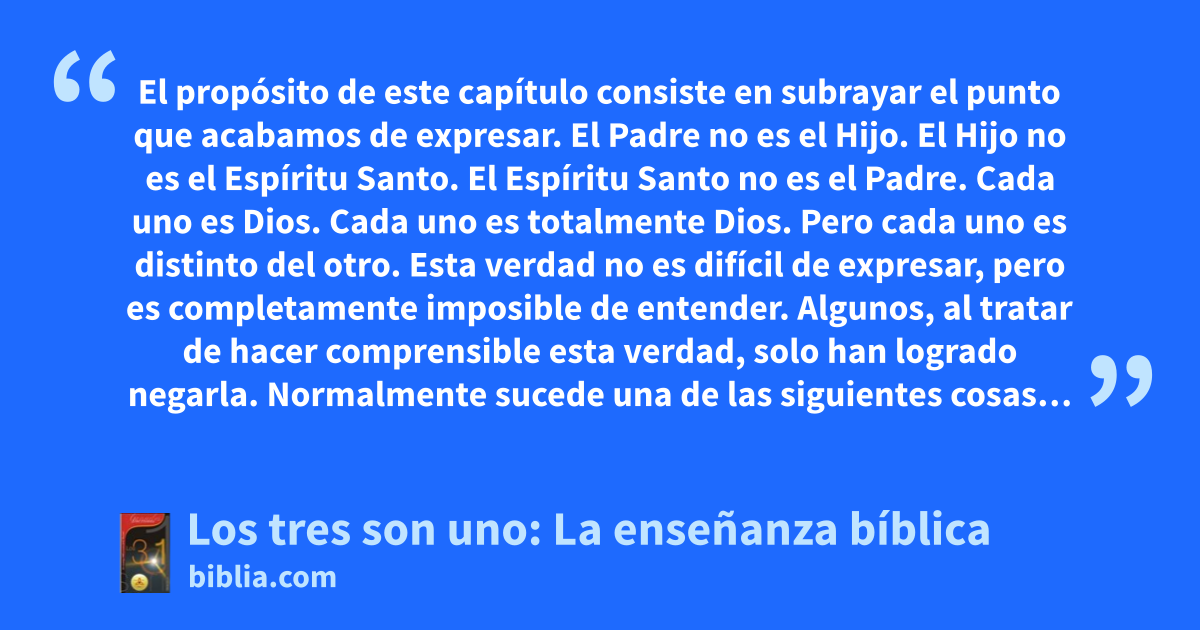 El propósito de este capítulo consiste en subrayar el punto que acabamos de expresar. El Padre no es el Hijo. El Hijo no es el Espíritu Santo. El Espíritu Santo no es el Padre. Cada uno es Dios. Cada uno es totalmente Dios. Pero cada uno es distinto del otro. Esta verdad no es difícil de expresar, pero es completamente imposible de entender. Algunos, al tratar de hacer comprensible esta verdad, solo han logrado negarla. Normalmente sucede una de las siguientes cosas…