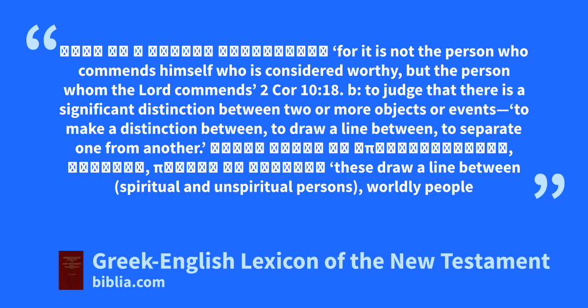 ἀλλὰ ὃν ὁ κύριος συνίστησιν ‘for it is not the person who commends himself who is considered worthy, but the person whom the Lord commends’ 2 Cor 10:18. b: to judge that there is a significant distinction between two or more objects or events—‘to make a distinction between, to draw a line between, to separate one from another.’ οὗτοί εἰσιν οἱ ἀποδιορίζοντες, ψυχικοί, πνεῦμα μὴ ἔχοντες ‘these draw a line between (spiritual and unspiritual persons), worldly people