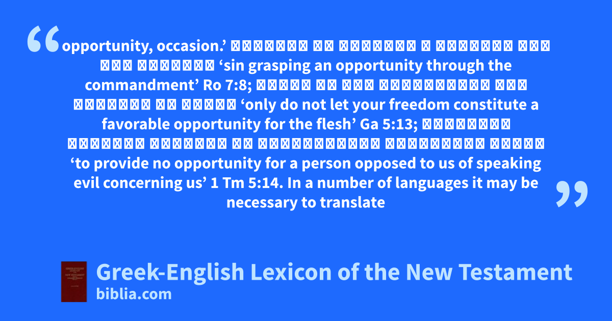 opportunity, occasion.’ ἀφορμὴν δὲ λαβοῦσα ἡ ἁμαρτία διὰ τῆς ἐντολῆς ‘sin grasping an opportunity through the commandment’ Ro 7:8; μόνον μὴ τὴν ἐλευθερίαν εἰς ἀφορμὴν τῇ σαρκί ‘only do not let your freedom constitute a favorable opportunity for the flesh’ Ga 5:13; μηδεμίαν ἀφορμὴν διδόναι τῷ ἀντικειμένῳ λοιδορίας χάριν ‘to provide no opportunity for a person opposed to us of speaking evil concerning us’ 1 Tm 5:14. In a number of languages it may be necessary to translate