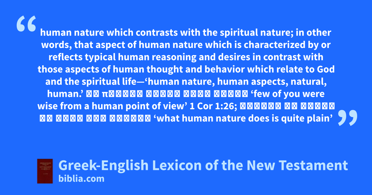 human nature which contrasts with the spiritual nature; in other words, that aspect of human nature which is characterized by or reflects typical human reasoning and desires in contrast with those aspects of human thought and behavior which relate to God and the spiritual life—‘human nature, human aspects, natural, human.’ οὐ πολλοὶ σοφοὶ κατὰ σάρκα ‘few of you were wise from a human point of view’ 1 Cor 1:26; φανερὰ δέ ἐστιν τὰ ἔργα τῆς σαρκός ‘what human nature does is quite plain’