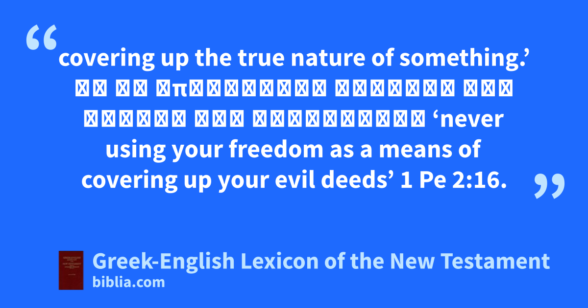 covering up the true nature of something.’ μὴ ὡς ἐπικάλυμμα ἔχοντες τῆς κακίας τὴν ἐλευθερίαν ‘never using your freedom as a means of covering up your evil deeds’ 1 Pe 2:16.