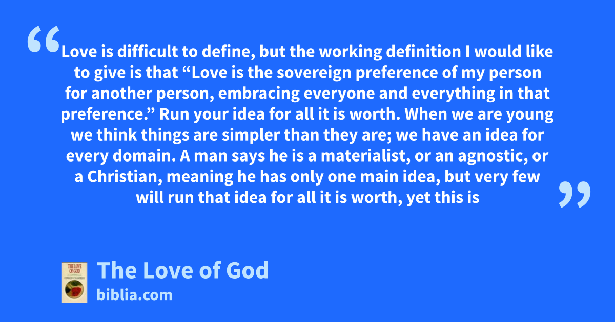 Love is difficult to define, but the working definition I would like to give is that “Love is the sovereign preference of my person for another person, embracing everyone and everything in that preference.” Run your idea for all it is worth. When we are young we think things are simpler than they are; we have an idea for every domain. A man says he is a materialist, or an agnostic, or a Christian, meaning he has only one main idea, but very few will run that idea for all it is worth, yet this is