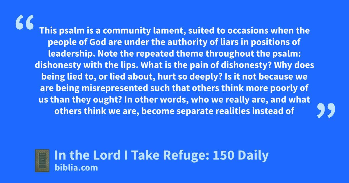 This psalm is a community lament, suited to occasions when the people of God are under the authority of liars in positions of leadership. Note the repeated theme throughout the psalm: dishonesty with the lips. What is the pain of dishonesty? Why does being lied to, or lied about, hurt so deeply? Is it not because we are being misrepresented such that others think more poorly of us than they ought? In other words, who we really are, and what others think we are, become separate realities instead of