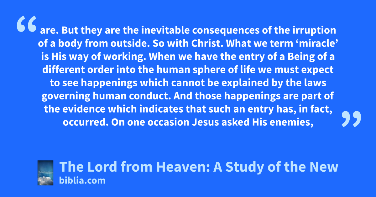 are. But they are the inevitable consequences of the irruption of a body from outside. So with Christ. What we term ‘miracle’ is His way of working. When we have the entry of a Being of a different order into the human sphere of life we must expect to see happenings which cannot be explained by the laws governing human conduct. And those happenings are part of the evidence which indicates that such an entry has, in fact, occurred. On one occasion Jesus asked His enemies,