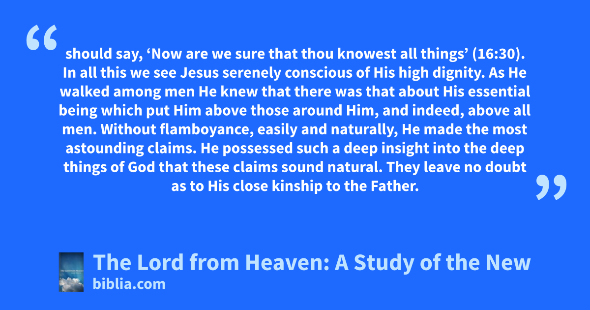 should say, ‘Now are we sure that thou knowest all things’ (16:30). In all this we see Jesus serenely conscious of His high dignity. As He walked among men He knew that there was that about His essential being which put Him above those around Him, and indeed, above all men. Without flamboyance, easily and naturally, He made the most astounding claims. He possessed such a deep insight into the deep things of God that these claims sound natural. They leave no doubt as to His close kinship to the Father.