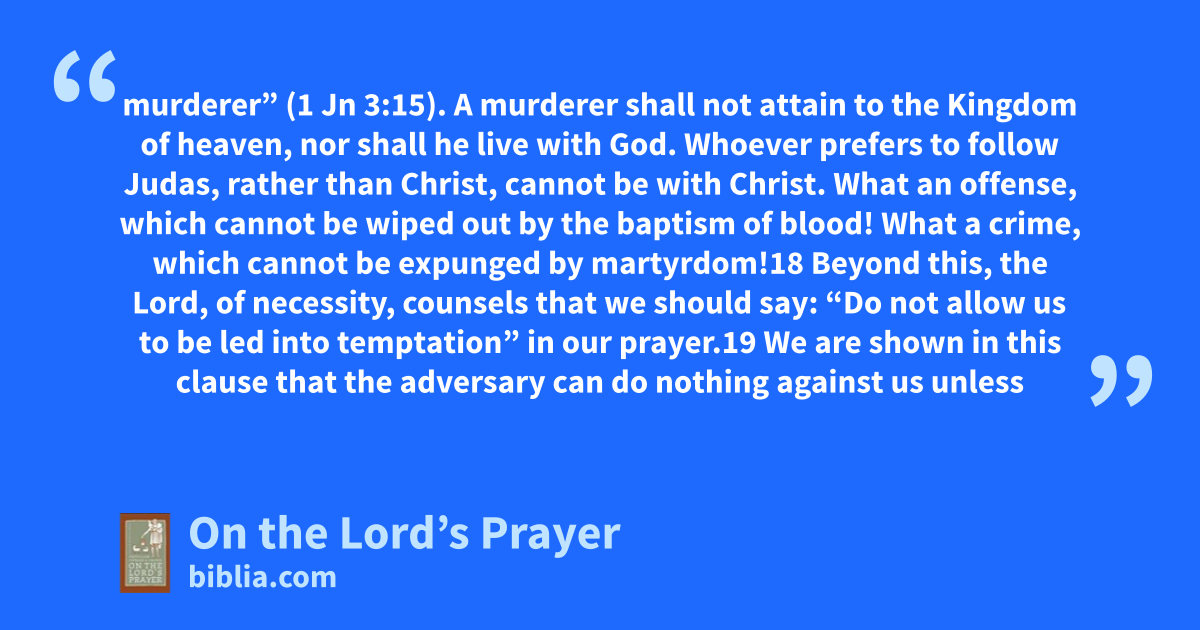 murderer” (1 Jn 3:15). A murderer shall not attain to the Kingdom of heaven, nor shall he live with God. Whoever prefers to follow Judas, rather than Christ, cannot be with Christ. What an offense, which cannot be wiped out by the baptism of blood! What a crime, which cannot be expunged by martyrdom!18 Beyond this, the Lord, of necessity, counsels that we should say: “Do not allow us to be led into temptation” in our prayer.19 We are shown in this clause that the adversary can do nothing against us unless