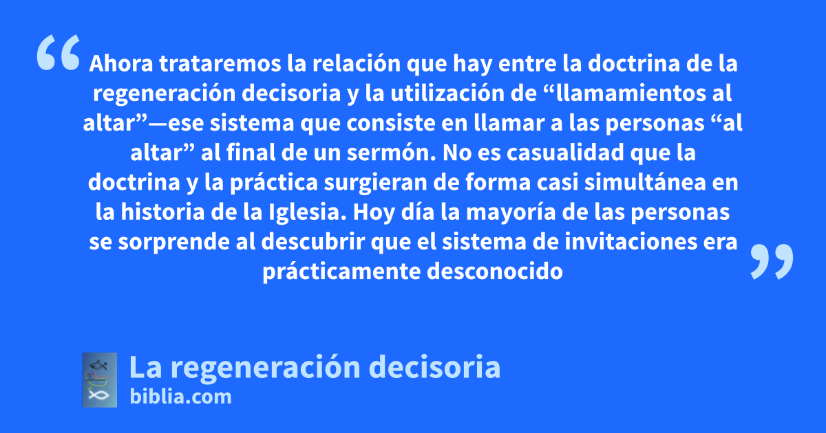 Ahora trataremos la relación que hay entre la doctrina de la regeneración decisoria y la utilización de “llamamientos al altar”—ese sistema que consiste en llamar a las personas “al altar” al final de un sermón. No es casualidad que la doctrina y la práctica surgieran de forma casi simultánea en la historia de la Iglesia. Hoy día la mayoría de las personas se sorprende al descubrir que el sistema de invitaciones era prácticamente desconocido