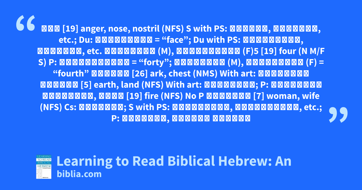 אַף [19] anger, nose, nostril (NFS) S with PS: אַפִּי, אַפְּךָ, etc.; Du: אַפַּ֫יִם = “face”; Du with PS: אַפֶּ֫יךָ, אַפָּיו, etc. אַרְבַּע (M), אַרְבָּעָה (F)5 [19] four (N M/F S) P: אַרְבָּעִים = “forty”; רְבִיעִי (M), רְבִיעִית (F) = “fourth” אֲרוֹן [26] ark, chest (NMS) With art: הָאָרוֹן אֶ֫רֶץ [5] earth, land (NFS) With art: הָאָ֫רֶץ; P: אֲרָצוֹת אַרְצוֹת, אֵשׁ [19] fire (NFS) No P אִשָּׁה [7] woman, wife (NFS) Cs: אֵ֫שְׁת; S with PS: אִשְׁתִּי, אִשְׁתְּךָ, etc.; P: נָשִׁים, נְשֵׁי אֲשֶׁר