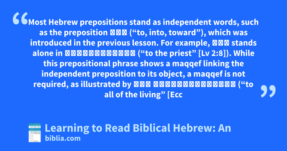 Most Hebrew prepositions stand as independent words, such as the preposition אֶל (“to, into, toward”), which was introduced in the previous lesson. For example, אֶל stands alone in אֶל־הַכֹּהֵן (“to the priest” [Lv 2:8]). While this prepositional phrase shows a maqqef linking the independent preposition to its object, a maqqef is not required, as illustrated by אֶל כָּל־הַחַיִּים (“to all of the living” [Ecc