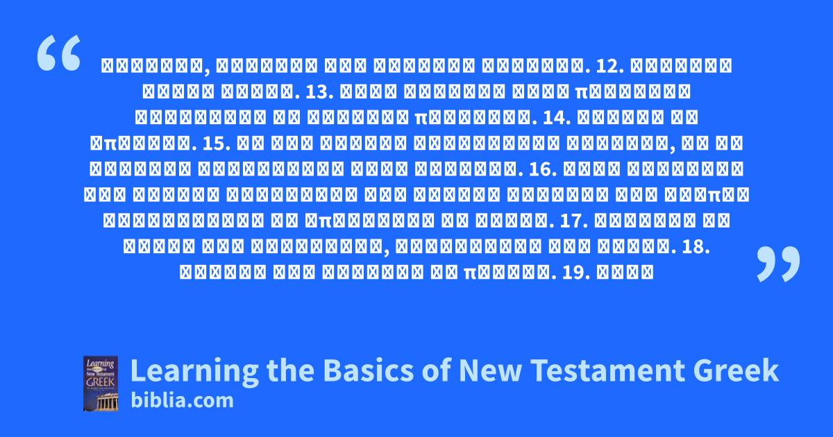 μαθηταί, καρδίαν γὰρ καθαρὰν ἔχουσιν. 12. ἀγγέλων φωναὶ καλαί. 13. τοὺς τελώνας τοὺς πονηροὺς κρίνουσιν οἱ δίκαιοι προφῆται. 14. νεκροὶ οἱ ἄπιστοι. 15. οἱ μὲν ἄδικοι εὑρίσκουσι θάνατον, οἱ δὲ δίκαιοι λαμβάνουσι ζωὴν αἰώνιον. 16. τοῖς μαθηταῖς τῆς μικρᾶς ἐκκλησίας τὴν καινὴν ἐντολὴν τῆς ἀγάπης κηρύσσουσιν οἱ ἀπόστολοι οἱ ἅγιοι. 17. μακάρια τὰ τέκνα τῆς βασιλείας, μανθάνουσι γὰρ ἀγαθά. 18. ἀγαθοὶ καὶ δίκαιοι οἱ πιστοί. 19. οὐδὲ