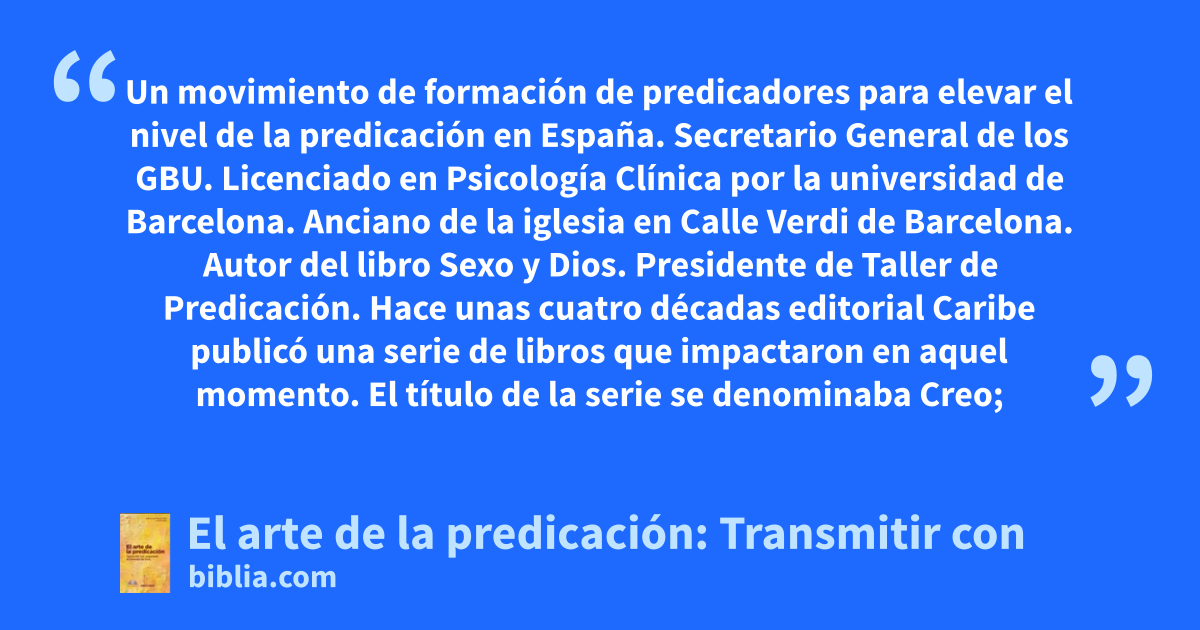 Un movimiento de formación de predicadores para elevar el nivel de la predicación en España. Secretario General de los GBU. Licenciado en Psicología Clínica por la universidad de Barcelona. Anciano de la iglesia en Calle Verdi de Barcelona. Autor del libro Sexo y Dios. Presidente de Taller de Predicación. Hace unas cuatro décadas editorial Caribe publicó una serie de libros que impactaron en aquel momento. El título de la serie se denominaba Creo;