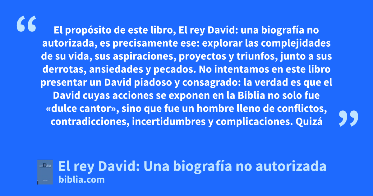 El propósito de este libro, El rey David: una biografía no autorizada, es precisamente ese: explorar las complejidades de su vida, sus aspiraciones, proyectos y triunfos, junto a sus derrotas, ansiedades y pecados. No intentamos en este libro presentar un David piadoso y consagrado: la verdad es que el David cuyas acciones se exponen en la Biblia no solo fue «dulce cantor», sino que fue un hombre lleno de conflictos, contradicciones, incertidumbres y complicaciones. Quizá
