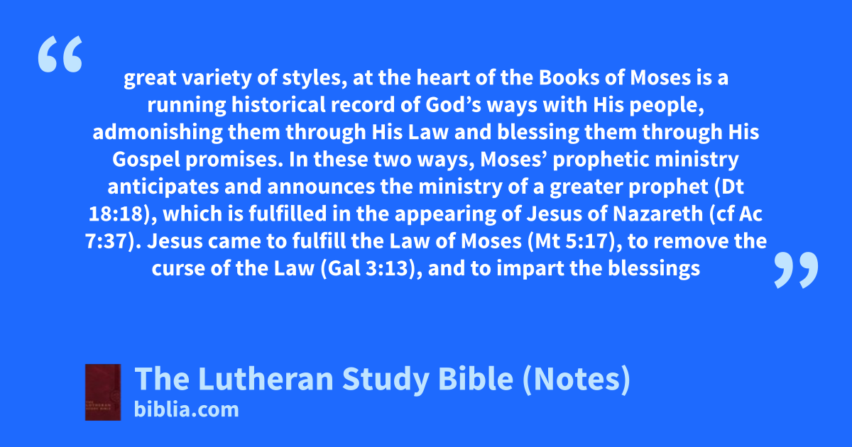 great variety of styles, at the heart of the Books of Moses is a running historical record of God’s ways with His people, admonishing them through His Law and blessing them through His Gospel promises. In these two ways, Moses’ prophetic ministry anticipates and announces the ministry of a greater prophet (Dt 18:18), which is fulfilled in the appearing of Jesus of Nazareth (cf Ac 7:37). Jesus came to fulfill the Law of Moses (Mt 5:17), to remove the curse of the Law (Gal 3:13), and to impart the blessings