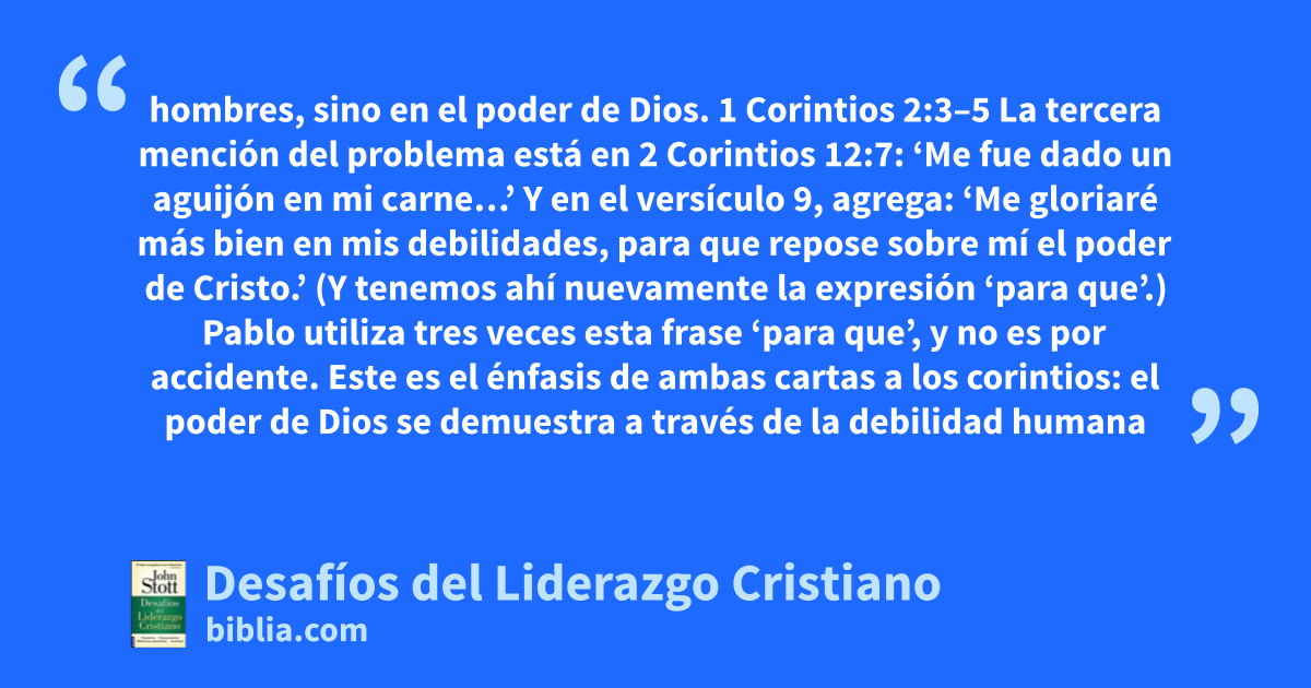 hombres, sino en el poder de Dios. 1 Corintios 2:3–5 La tercera mención del problema está en 2 Corintios 12:7: ‘Me fue dado un aguijón en mi carne…’ Y en el versículo 9, agrega: ‘Me gloriaré más bien en mis debilidades, para que repose sobre mí el poder de Cristo.’ (Y tenemos ahí nuevamente la expresión ‘para que’.) Pablo utiliza tres veces esta frase ‘para que’, y no es por accidente. Este es el énfasis de ambas cartas a los corintios: el poder de Dios se demuestra a través de la debilidad humana