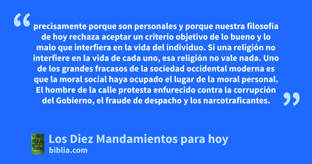 precisamente porque son personales y porque nuestra filosofía de hoy rechaza aceptar un criterio objetivo de lo bueno y lo malo que interfiera en la vida del individuo. Si una religión no interfiere en la vida de cada uno, esa religión no vale nada. Uno de los grandes fracasos de la sociedad occidental moderna es que la moral social haya ocupado el lugar de la moral personal. El hombre de la calle protesta enfurecido contra la corrupción del Gobierno, el fraude de despacho y los narcotraficantes.