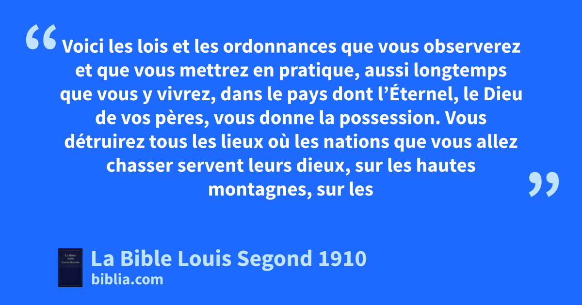 1Voici les lois et les ordonnances que vous observerez et que vous mettrez en pratique, aussi longtemps que vous y vivrez, dans le pays dont l’Éternel, le Dieu de vos pères, vous donne la possession. 2aVous détruirez tous les lieux où les nations que vous allez chasser servent leurs dieux, sur les hautes montagnes, sur les collines, et sous tout arbre vert. 3Vous renverserez bleurs autels, vous briserez leurs statues, vous brûlerez au feu leurs idoles, vous abattrez les images taillées de leurs dieux, et vous ferez disparaître leurs noms de ces lieux-là.