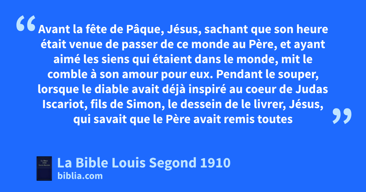1Avant ala fête de Pâque, Jésus, sachant que son heure était venue de passer de ce monde au Père, et ayant aimé les siens qui étaient dans le monde, mit le comble à son amour pour eux. 2Pendant le souper, blorsque le diable avait déjà inspiré au coeur de Judas Iscariot, fils de Simon, le dessein de le livrer, 3Jésus, qui savait cque le Père avait remis toutes choses entre ses mains, dqu’il était venu de Dieu, et qu’il s’en allait à Dieu, 4se leva de table, ôta ses vêtements, et prit un linge, dont il se ceignit. 5Ensuite il versa de l’eau dans un bassin, et il se mit à laver les pieds des disciples, et à les essuyer avec le linge dont il était ceint. 6Il vint donc à Simon Pierre; et Pierre lui dit: Toi, Seigneur, etu me laves les pieds! 7Jésus lui répondit: Ce que je fais, tu ne le comprends pas maintenant, mais tu le comprendras bientôt. 8Pierre lui dit: Non, jamais tu ne me laveras les pieds. Jésus lui répondit: Si je ne te lave, tu n’auras point de part avec moi. 9Simon Pierre lui dit: Seigneur, non seulement les pieds, mais encore les mains et la tête. 10Jésus lui dit: Celui qui est lavé n’a besoin que de se laver les pieds pour être entièrement pur; fet vous êtes purs, mais non pas tous. 11gCar il connaissait celui qui le livrait; c’est pourquoi il dit: Vous n’êtes pas tous purs. 12Après qu’il leur eut lavé les pieds, et qu’il eut pris ses vêtements, il se remit à table, et leur dit: Comprenez-vous ce que je vous ai fait?