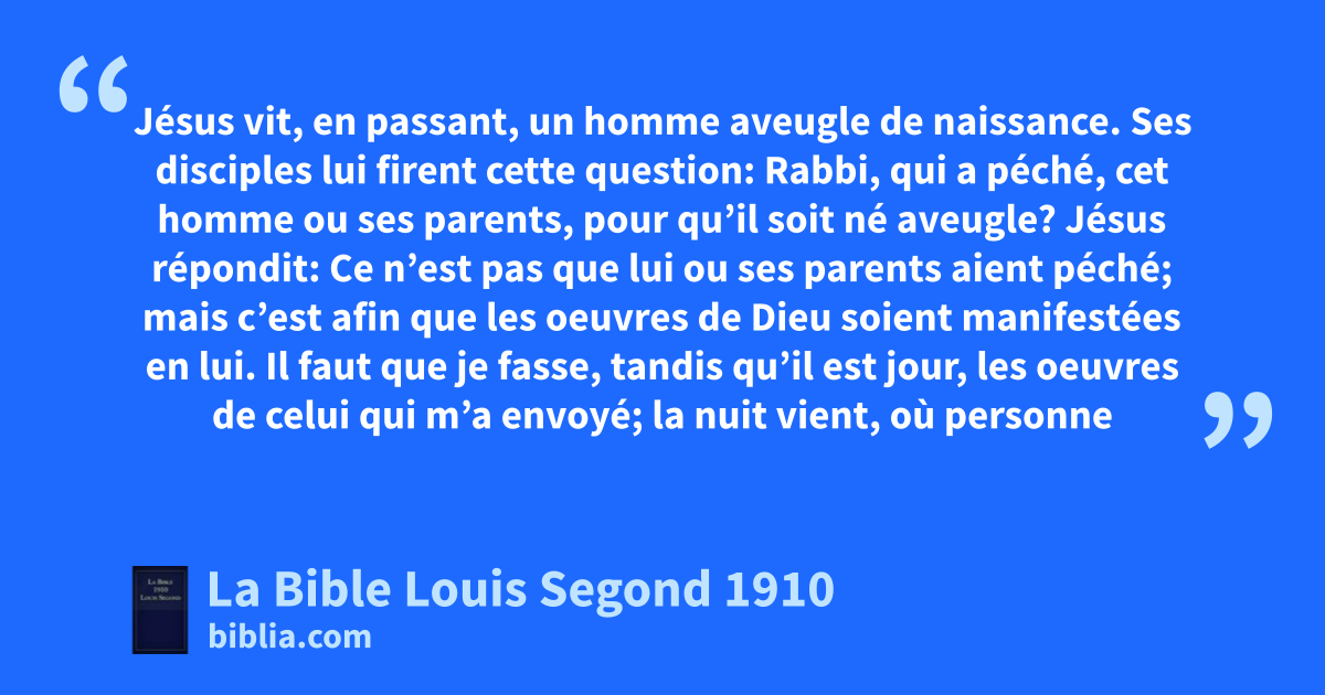 1Jésus vit, en passant, un homme aveugle de naissance. 2Ses disciples lui firent cette question: Rabbi, qui a péché, cet homme ou ses parents, pour qu’il soit né aveugle? 3Jésus répondit: Ce n’est pas que lui ou ses parents aient péché; amais c’est afin que les oeuvres de Dieu soient manifestées en lui.