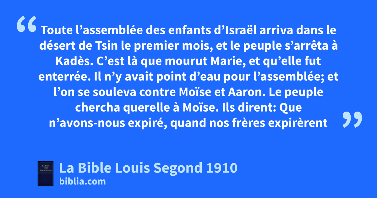 1Toute l’assemblée des enfants d’Israël arriva dans le désert de Tsin le premier mois, et le peuple s’arrêta à Kadès. C’est là que mourut Marie, et qu’elle fut enterrée. 2Il n’y avait point d’eau pour l’assemblée; et l’on se souleva contre Moïse et Aaron. 3Le peuple chercha querelle à Moïse. Ils dirent: Que n’avons-nous expiré, quand anos frères expirèrent devant l’Éternel? 4Pourquoi avez-vous fait venir l’assemblée de l’Éternel dans ce désert, pour que nous y mourions, nous et notre bétail? 5Pourquoi nous avez-vous fait monter hors d’Égypte, pour nous amener dans ce méchant lieu? Ce n’est pas un lieu où l’on puisse semer, et il n’y a ni figuier, ni vigne, ni grenadier, ni d’eau à boire. 6Moïse et Aaron s’éloignèrent de l’assemblée pour aller à l’entrée de la tente d’assignation. Ils tombèrent sur leur visage; et la gloire de l’Éternel leur apparut. 7L’Éternel parla à Moïse, et dit: 8Prends la verge, et convoque l’assemblée, toi et ton frère Aaron. Vous parlerez en leur présence au rocher, et il donnera ses eaux; btu feras sortir pour eux de l’eau du rocher, et tu abreuveras l’assemblée et leur bétail. 9Moïse prit la verge qui était devant l’Éternel, comme l’Éternel le lui avait ordonné. 10Moïse et Aaron convoquèrent l’assemblée en face du rocher. cEt Moïse leur dit: Écoutez donc, rebelles! dEst-ce de ce rocher que nous vous ferons sortir de l’eau? 11Puis Moïse leva la main et frappa deux fois le rocher avec sa verge. eIl sortit de l’eau en abondance. fL’assemblée but, et le bétail aussi. 12Alors l’Éternel dit à Moïse et à Aaron: gParce que vous n’avez pas cru en moi, pour me sanctifier aux yeux des enfants d’Israël, vous ne ferez point entrer cette assemblée dans le pays que je lui donne. 13Ce sont les eaux de Meriba, où les enfants d’Israël contestèrent avec l’Éternel, qui fut sanctifié en eux.