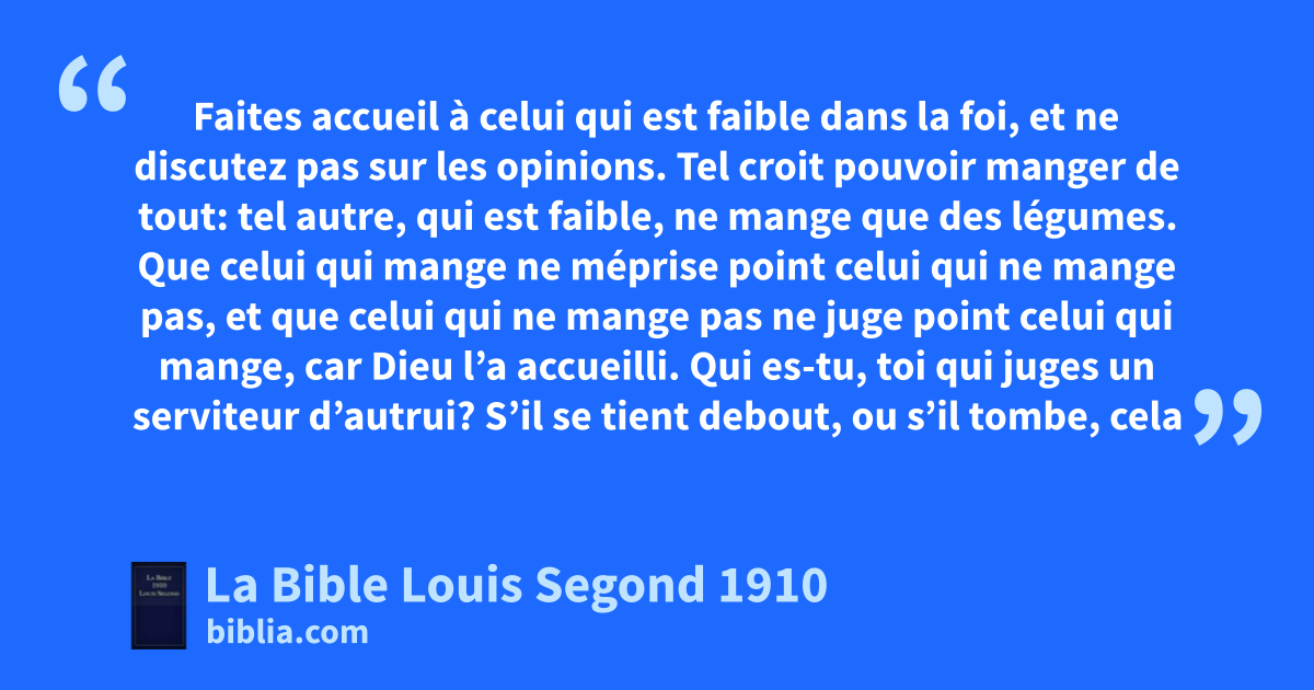 1Faites accueil à celui qui est faible dans la foi, et ne discutez pas sur les opinions. 2Tel croit pouvoir manger de tout: tel autre, qui est faible, ne mange que des légumes. 3aQue celui qui mange ne méprise point celui qui ne mange pas, et que celui qui ne mange pas ne juge point celui qui mange, car Dieu l’a accueilli. 4bQui es-tu, toi qui juges un serviteur d’autrui? S’il se tient debout, ou s’il tombe, cela regarde son maître. Mais il se tiendra debout, car le Seigneur a le pouvoir de l’affermir. 5cTel fait une distinction entre les jours; tel autre les estime tous égaux. Que chacun ait en son esprit une pleine conviction. 6Celui qui distingue entre les jours agit ainsi pour le Seigneur. Celui qui mange, c’est pour le Seigneur qu’il mange, dcar il rend grâces à Dieu; celui qui ne mange pas, c’est pour le Seigneur qu’il ne mange pas, et il rend grâces à Dieu. 7eEn effet, nul de nous ne vit pour lui-même, et nul ne meurt pour lui-même. 8Car si nous vivons, nous vivons pour le Seigneur; et si nous mourons, nous mourons pour le Seigneur. Soit donc que nous vivions, soit que nous mourions, nous sommes au Seigneur. 9Car Christ est mort et il a vécu, afin de dominer sur les morts et sur les vivants. 10Mais toi, pourquoi juges-tu ton frère? ou toi, pourquoi méprises-tu ton frère? fpuisque nous comparaîtrons tous devant le tribunal de Dieu. 11Car il est écrit: