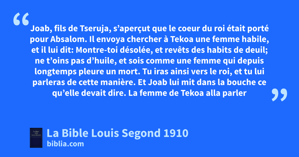 1Joab, fils de Tseruja, s’aperçut que le coeur du roi était porté pour Absalom. 2Il envoya chercher à Tekoa une femme habile, et il lui dit: Montre-toi désolée, et revêts des habits de deuil; ne t’oins pas d’huile, et sois comme une femme qui depuis longtemps pleure un mort. 3Tu iras ainsi vers le roi, et tu lui parleras de cette manière. Et Joab lui mit dans la bouche ce qu’elle devait dire. 4La femme de Tekoa alla parler au roi. Elle tomba la face contre terre et se prosterna, et elle dit: O roi, sauve-moi! 5Le roi lui dit: Qu’as-tu? Elle répondit: Oui, je suis veuve, mon mari est mort! 6Ta servante avait deux fils; ils se sont tous deux querellés dans les champs, et il n’y avait personne pour les séparer; l’un a frappé l’autre, et l’a tué. 7Et voici, toute la famille s’est levée contre ta servante, en disant: Livre le meurtrier de son frère! Nous voulons le faire mourir, pour la vie de son frère qu’il a tué; nous voulons détruire même l’héritier! Ils éteindraient ainsi le tison qui me reste, pour ne laisser à mon mari ni nom ni survivant sur la face de la terre. 8Le roi dit à la femme: Va dans ta maison. Je donnerai des ordres à ton sujet. 9La femme de Tekoa dit au roi: C’est sur moi, ô roi mon seigneur, et sur la maison de mon père, que le châtiment va tomber; le roi et son trône n’auront pas à en souffrir. 10Le roi dit: Si quelqu’un parle contre toi, amène-le-moi, et il ne lui arrivera plus de te toucher. 11Elle dit: Que le roi se souvienne de l’Éternel, ton Dieu, afin que le vengeur du sang n’augmente pas la ruine, et qu’on ne détruise pas mon fils! Et il dit: L’Éternel est vivant! il ne tombera pas à terre un cheveu de ton fils. 12La femme dit: Permets que ta servante dise un mot à mon seigneur le roi. Et il dit: Parle! 13La femme dit: Pourquoi penses-tu de la sorte à l’égard du peuple de Dieu, puisqu’il résulte des paroles mêmes du roi que le roi est comme coupable en ne rappelant pas celui qu’il a proscrit? 14Il nous faut certainement mourir, et nous serons comme des eaux répandues à terre et qui ne se rassemblent plus; Dieu n’ôte pas la vie, mais il désire que le fugitif ne reste pas banni de sa présence. 15Maintenant, si je suis venue dire ces choses au roi mon seigneur, c’est que le peuple m’a effrayée. Et ta servante a dit: Je veux parler au roi; peut-être le roi fera-t-il ce que dira sa servante. 16Oui, le roi écoutera sa servante, pour la délivrer de la main de ceux qui cherchent à nous exterminer, moi et mon fils, de l’héritage de Dieu. 17Ta servante a dit: Que la parole de mon seigneur le roi me donne le repos. Car mon seigneur le roi est comme un ange de Dieu, prêt à entendre le bien et le mal. Et que l’Éternel, ton Dieu, soit avec toi! 18Le roi répondit, et dit à la femme: Ne me cache pas ce que je vais te demander. Et la femme dit: Que mon seigneur le roi parle! 19Le roi dit alors: La main de Joab n’est-elle pas avec toi dans tout ceci? Et la femme répondit: Aussi vrai que ton âme est vivante, ô roi mon seigneur, il n’y a rien à droite ni à gauche de tout ce que dit mon seigneur le roi. C’est, en effet, ton serviteur Joab qui m’a donné des ordres, et qui a mis dans la bouche de ta servante toutes ces paroles. 20C’est pour donner à la chose une autre tournure que ton serviteur Joab a fait cela. Mais mon seigneur est aussi sage qu’un ange de Dieu, pour connaître tout ce qui se passe sur la terre.