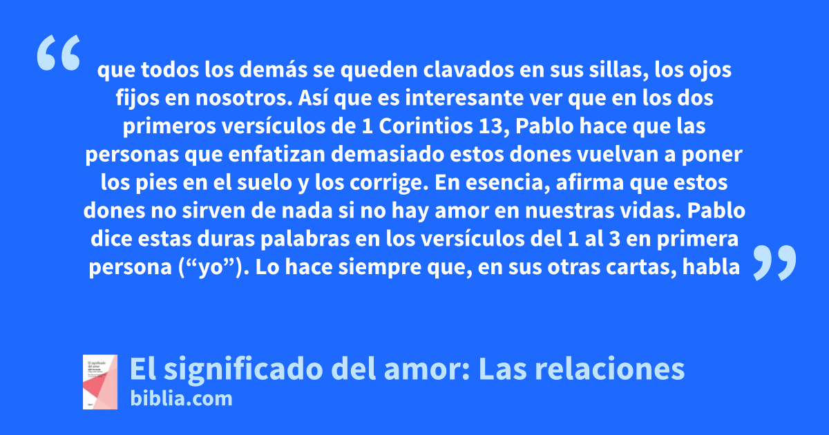 que todos los demás se queden clavados en sus sillas, los ojos fijos en nosotros. Así que es interesante ver que en los dos primeros versículos de 1 Corintios 13, Pablo hace que las personas que enfatizan demasiado estos dones vuelvan a poner los pies en el suelo y los corrige. En esencia, afirma que estos dones no sirven de nada si no hay amor en nuestras vidas. Pablo dice estas duras palabras en los versículos del 1 al 3 en primera persona (“yo”). Lo hace siempre que, en sus otras cartas, habla