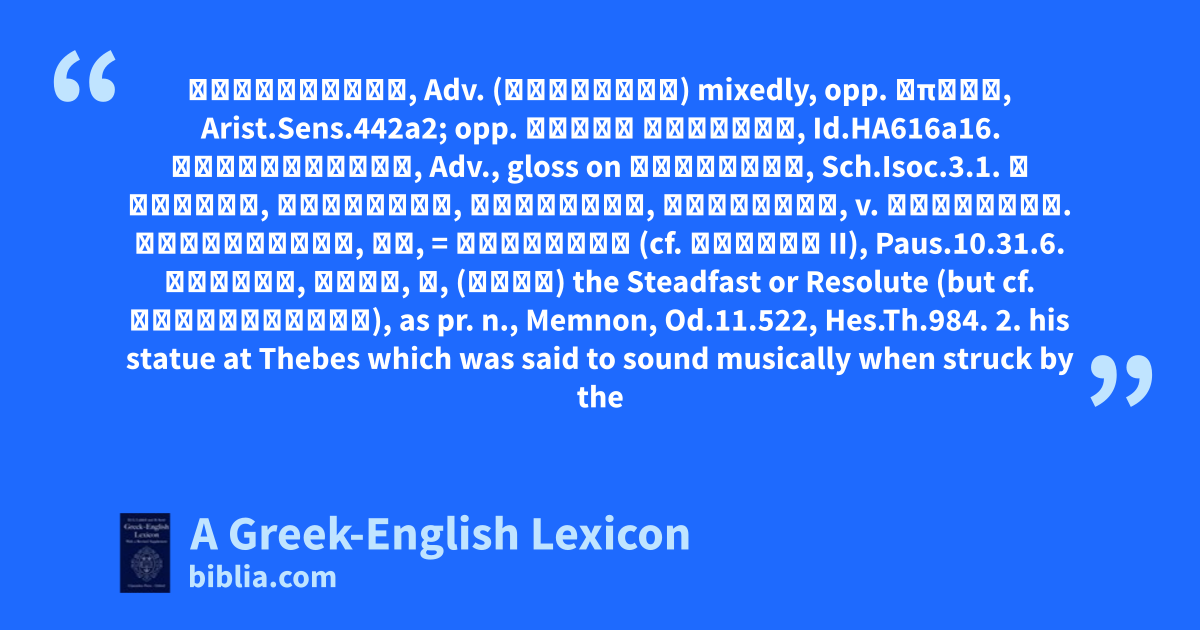 μεμιγμένως, Adv. (μείγνυμι) mixedly, opp. ἁπλῶς, Arist.Sens.442a2; opp. χωρὶς ἕκαστον, Id.HA616a16. μεμῑσημένως, Adv., gloss on δυσκόλως, Sch.Isoc.3.1. ✪ μέμνεο, μεμνέῳτο, μέμνημαι, μεμνῄμην, v. μιμνήσκω. μεμνονίδες, αἱ, = Μέμνονες (cf. Μέμνων II), Paus.10.31.6. Μέμνων, ονος, ὁ, (μένω) the Steadfast or Resolute (but cf. θρασυμέμνων), as pr. n., Memnon, Od.11.522, Hes.Th.984. 2. his statue at Thebes which was said to sound musically when struck by the
