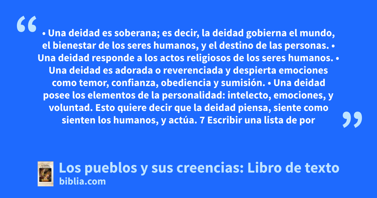 • Una deidad es soberana; es decir, la deidad gobierna el mundo, el bienestar de los seres humanos, y el destino de las personas. • Una deidad responde a los actos religiosos de los seres humanos. • Una deidad es adorada o reverenciada y despierta emociones como temor, confianza, obediencia y sumisión. • Una deidad posee los elementos de la personalidad: intelecto, emociones, y voluntad. Esto quiere decir que la deidad piensa, siente como sienten los humanos, y actúa. 7 Escribir una lista de por