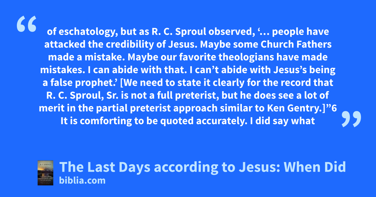 of eschatology, but as R. C. Sproul observed, ‘… people have attacked the credibility of Jesus. Maybe some Church Fathers made a mistake. Maybe our favorite theologians have made mistakes. I can abide with that. I can’t abide with Jesus’s being a false prophet.’ [We need to state it clearly for the record that R. C. Sproul, Sr. is not a full preterist, but he does see a lot of merit in the partial preterist approach similar to Ken Gentry.]”6 It is comforting to be quoted accurately. I did say what