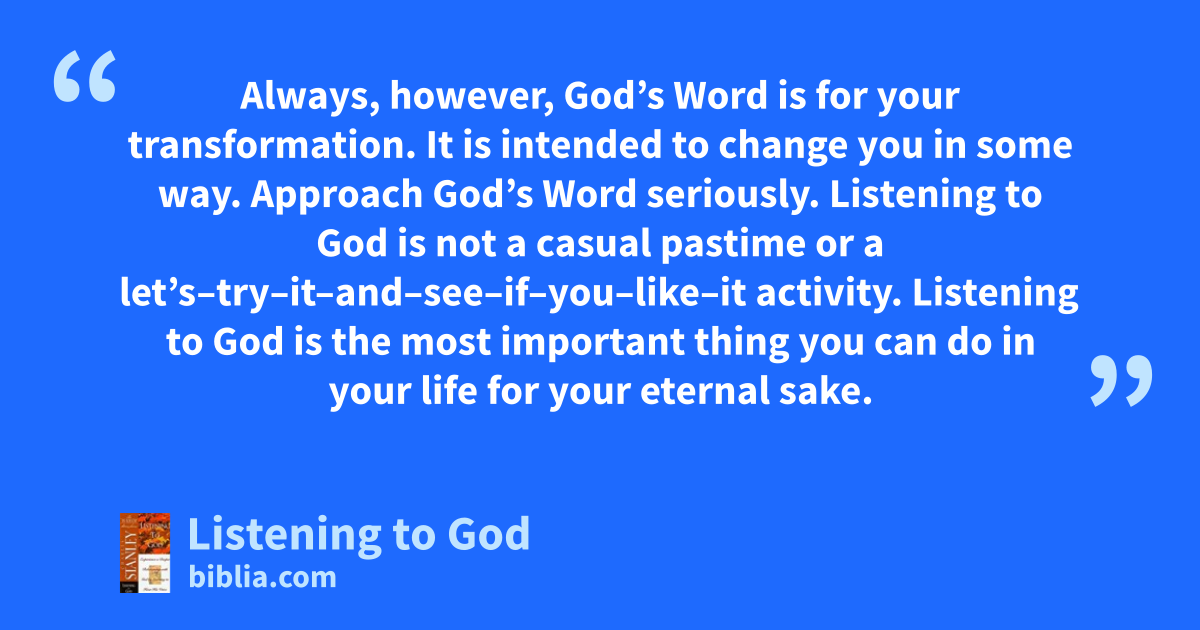 Always, however, God’s Word is for your transformation. It is intended to change you in some way. Approach God’s Word seriously. Listening to God is not a casual pastime or a let’s–try–it–and–see–if–you–like–it activity. Listening to God is the most important thing you can do in your life for your eternal sake.
